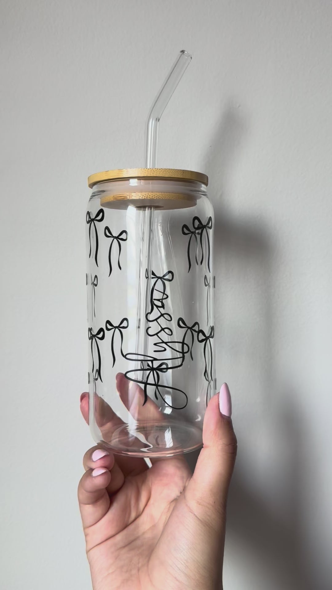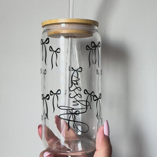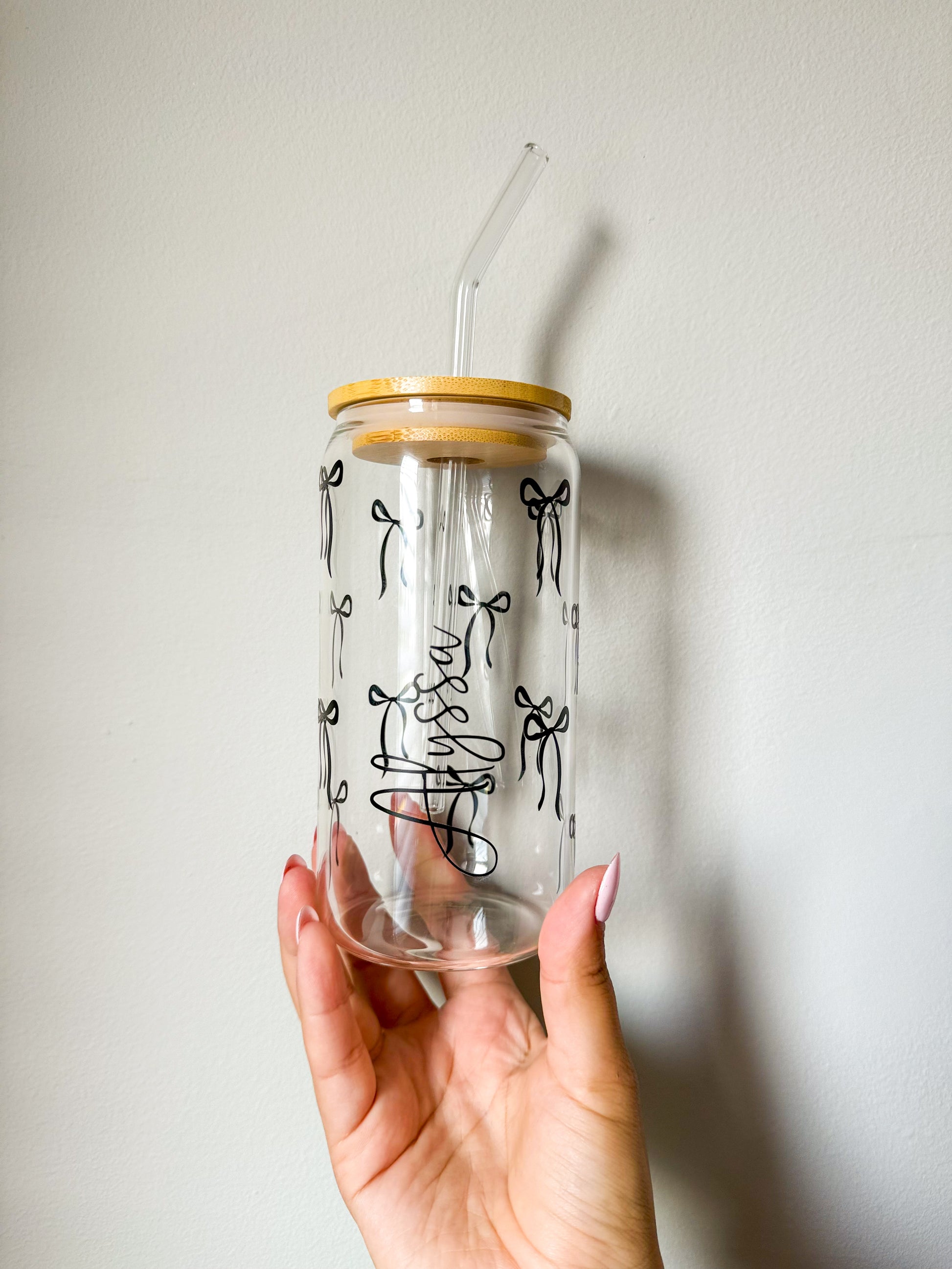 Sip in style with this custom glass cup featuring a chic black bow design and your personalized name. Perfect for iced coffee cups, matcha cups, or aesthetic glass tumblers, it’s the ultimate accessory for anyone who loves the coquette aesthetic, girly drinkware, or custom gifts. Perfect for coffee lovers, tea drinkers, and unique gift ideas.